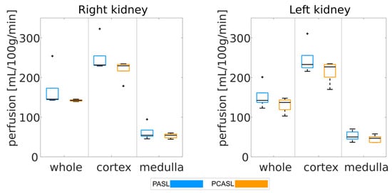 Looking at all the data sets with healthy perfusion (Figure 4), a narrow interquartile range of mean perfusion can be observed for whole kidney, cortex, and medulla for both left and right kidneys and for both labeling strategies. For the whole kidney, mean and standard deviation of renal perfusion across all healthy datasets were 150 +/− 40 mL/100 g/min and 130 +/− 10 mL/100 g/min for PASL and PCASL, respectively. For the cortex, mean and standard deviation of renal perfusion across all healthy datasets were 240 +/− 40 mL/100 g/min and 210 +/− 20 mL/100 g/min for PASL and PCASL, respectively. For the medulla, mean and standard deviation of renal perfusion across all healthy datasets were 50 +/− 20 mL/100 g/min and 49 +/− 8 mL/100 g/min for PASL and PCASL, respectively. This corresponds well to the perfusion values originally assumed to generate the synthetic data (250 mL/100 g/min and 50 mL/100 g/min for the cortex and medulla, respectively).