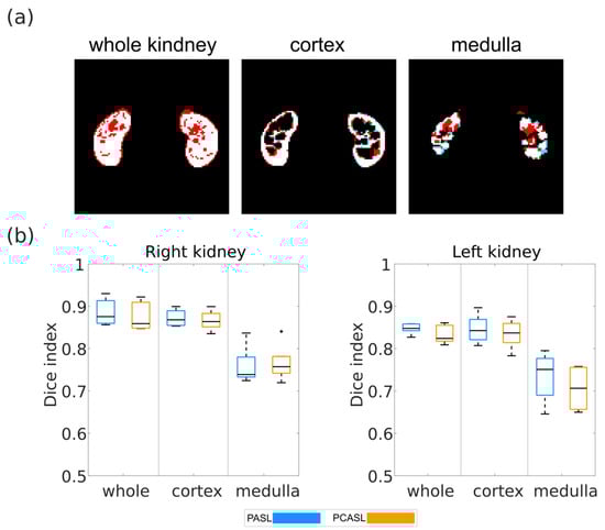 (a) Comparison of segmentation masks of the PCASL data set of model 108 obtained from the processing pipeline (red) and the XCAT phantom (cyan). White areas correspond to pixels present in both masks being compared. (b) Boxplots of Dice indices calculated for the five models for the PASL and PCAL data sets for whole kidney, cortex, and medulla. The black line in each boxplot shows the median of the distribution of mean perfusion across all models. The top and bottom part of each boxplot represent the 25th and 75th percentiles. The boxplots’ whiskers extend to the highest and lowest data points not considered as outliers. Outliers are shown a black ‘+’.