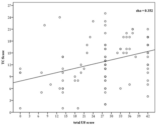 The relationship between the LUS scores and the CT scores was assessed by a linear regression analysis and dispersion graph (Figure 2), showing a positive linear relationship between the two evaluation scoring systems, which despite not being high (rho = 0.352), did however reach statistical significance (p = 0.008) (Figure 3).