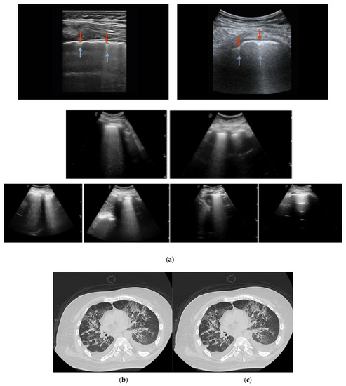CT and LUS imaging scans of different scores. In these figures the pleural line (indicated by red arrows) is indented, and vertical areas of white (blue arrows) are visible below the indent, which reflect local alterations in the acoustical properties of the lung caused by replacement of air with water, blood, or collapsed tissue. A typical case of a COVID-19 pneumonia patient. (a) B-lines at the right and left of the lower lateral lung reflecting pneumonia (score 2); (b) B-lines at the right and left of the lower lateral lung reflecting pneumonia (score 3); (c) chest CT showing multiple infiltrations.