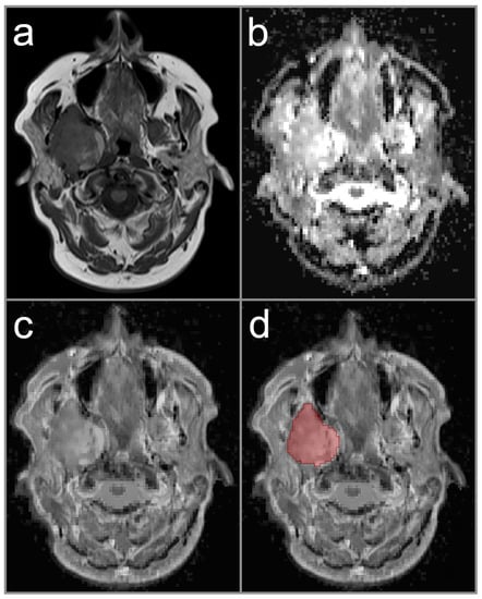 ADC data was processed using a dedicated software tool (Medical Imaging Interaction Toolkit (MITK), v2018.04.2, German Cancer Research Center (dkfz), Heidelberg, Germany) to measure the ADC values in the whole tumor volume (Volume-of-Interest, VOI). During VOI placement, co-registration of native T1-weighted, post-contrast T1-weighted, or T2-weighted MRI sequences were used for exact delineation of tumor boundaries on each image slice in axial orientation. The reader decided which conventional MRI sequence was appropriate for co-registration in each study case. Each drawn VOI in the ADC data was checked for consistency with co-registered conventional MRI sequence to avoid partial volume effects. In cases of multiple parotid lesions, the largest lesion was chosen for ADC assessment. Representative cases are provided in Figure 1, Figure 2 and Figure 3.