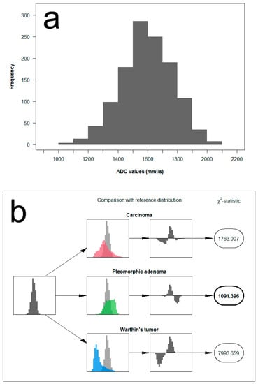 We propose a new approach that makes use of the full distribution of measured ADC values for the differentiation between the different parotid tumors. The concept is based on comparing the distribution of ADC values measured in a single patient with reference distributions and assessing the similarity to each other. Example cases illustrating the analysis algorithm are provided in Figure 4, Figure 5 and Figure 6.