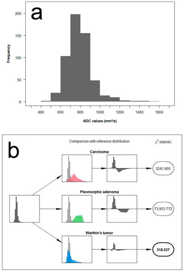 Beside the above-discussed methods of ADC data collection, choosing the appropriate ADC parameter for clinical decision-making is highly crucial. Mean ADC values are commonly used in clinical routine, since mean values are easy and quick to obtain, and their interpretation is straightforward [20]. Nevertheless, mean ADC values do not represent a robust parameter for the differentiation between benign and malignant parotid lesions, since their range of values is reported to possibly overlap [28]. In recent studies, different alternative ADC parameters were proposed for parotid lesion assessment, e.g., median and various percentiles [29]. Ma et al. showed superior diagnostic performance by using the 10th ADC percentile in comparison to mean ADC values [30]. They assumed that low-percentile ADC values are more likely to represent tumor areas with high cell density, thus possibly indicating a more aggressive biological behavior. By contrast, we used the whole histogram distribution for tumor differentiation and observed a consistent increase in diagnostic performance with respect to the cross-validated prediction accuracy. While these findings indicate an advantage using the full information of the shape and distribution of ADC values, the success of the proposed method strongly depends on the quality of the reference distributions, which have to be estimated beforehand. In this context, we divided the benign tumor group into two subgroups, PA and WT, to provide a dedicated subgroup analysis since these entities represent the most frequent tumor types in the parotid gland, and more importantly to obtain two separate reference distributions based on the fact that, PA and WT usually manifest with opposite ADC values, with PA usually higher and WT lower [26]. Blending these contrastive spectra into a single reference distribution would lead to higher Chi2-statistics as the data will only fit one or the other part of the mixture and therefore, likely resulting in misdiagnosis. In fact, this is the same reason why two separate thresholds are adopted in the traditional comparison of mean ADC values to which we compare our results. Naturally, a larger sample would provide better estimates for the three reference distributions used in this study, thus would possibly help to consolidate our results. In addition, pooled data from multiple centers may help to establish a standardized reference distribution among different tumor entities and their subtypes. This aspect seems to be desirable as malignant parotid tumors are rare compared to other malignancies in the head and neck area, thus relatively scarce encountered in a single center. Compared to the threshold values for the mean ADC, manually calculating the Chi2 test-statistics also involves slightly more effort. With larger samples, it might therefore make sense to describe the reference distribution using parametric models in order to reduce the number of parameters. The Chi2-test-statistic could then be possibly replaced by the sums of the likelihoods of the ADC values, but the general concept remains the same.