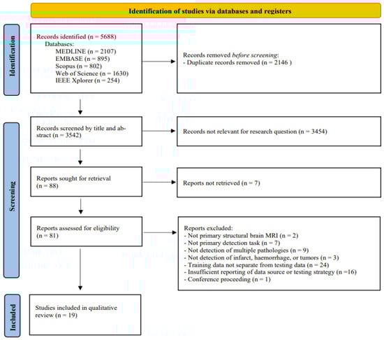 The literature was searched in MEDLINE (accessed through PubMed), Ovid Embase, Elsevier Scopus, Clarivate Web of Science, and IEEE Explore in order to find studies covering both clinical and technical aspects of the review question. The search period ranged between 1 January 2017 and 10 February 2022. This relatively short period was selected due to the nature of deep learning research, with rapid development cycles rendering older studies less relevant for the review question. Structured search terms (MeSH, Emtree), such as “magnetic resonance imaging”, “machine learning”, and “brain diseases”, were combined using Boolean operators and supplemented with free keyword search terms, such as “detection”, “classification”, “triaging”, or “workflow”. Multiple additional keywords describing pathologies of interest, such as “neoplasm”, “stroke”, “intraparenchymal hemorrhage”, “subarachnoid hemorrhages”, and “subdural hemorrhages”, were also included in the search string. The full search string can be found in Appendix A.