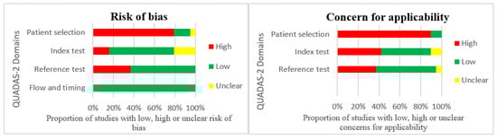 The Quality Assessment of Diagnostic Accuracy Studies 2 tool was applied to all included studies in this review. The results of the risk of bias/concern for applicability analysis are presented in Table 5 and summarized in Figure 2.