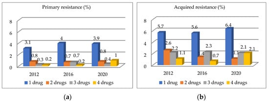 In the three studies from 2012, 2016, and 2020, the highest proportion of newly diagnosed patients excreted mycobacteria that was resistant to a single drug (3.1%, 4%, and 3.9%, respectively). Patients with tuberculosis resistant to two drugs accounted for 0.8% of all newly diagnosed patients. The highest percentage of three-drug resistance was recorded in 2016 at 0.7%, while in 2012 and 2020, it was 0.3% and 0.4%, respectively. In the newly diagnosed patients in the 2012 and 2016 studies, four-drug resistance was found to be 0.2%, whereas this group constituted 1% in 2020 (Figure 2a).
