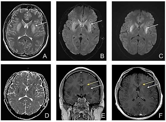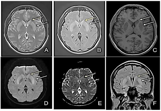 First Magnetic Resonance Imaging (MRI)—day 1 at the admission to our clinic (D1). (A) Axial T2-weighted image sequence: slightly increased bilateral putaminal and caudate nucleus signal; (B) Axial FLAIR sequence: increased bilateral putaminal and caudate nucleus signal; (C) Axial T1-weighted image sequence: slightly decreased bilateral putaminal and caudate nucleus signal; (D) Diffusion-weighted image sequence (DWI); (E) Apparent diffusion coefficient map (ADC): moderate bilateral putaminal restricted diffusion; (F) Coronal FLAIR image: slightly increased bilateral putaminal (white arrow) and caudate nucleus signal (yellow arrow).