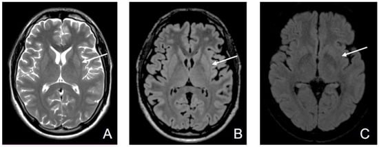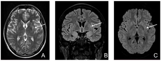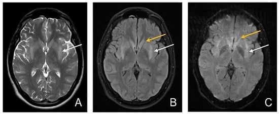 Third MRI—D11. (A) Axial T2-wi sequence: persistent high T2 signal intensity in posterior 2/3 of the putamen; (B) Axial FLAIR image: Symmetrical hyperintensity of the posterior 2/3 of the putamen (white arrow) and normal signal intensity of the caudate nucleus (yellow arrow); (C) Axial DWI: persistent symmetrical moderate restricted diffusion in the posterior 2/3 of the putamen (white arrow) and no restricted diffusion in the caudate nucleus (yellow arrow).