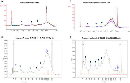 Size profiles of cell-free DNA (cfDNA) isolated from cell culture supernatant. CfDNA was directly isolated from the cell culture supernatant of a human bone osteosarcoma (143B) cell line and analyzed by four different automated microfluidic capillary electrophoresis assays of increasing sensitivity and resolution, including the (A) Bioanalyzer DNA 1000 kit; (B) Bioanalyzer HS DNA kit; (C) FA 915 kit; and (D) FA 930 kit. In all of the assays, DNA molecules are detected by laser-induced fluorescence, and the relative fluorescence of the upper marker (y axis) is used to calculate the concentration of differently sized-cfDNA populations within the sample. The size of individual cfDNA molecules (x axis) is determined by matching their migration times with the migration times of several internal standards of known size. Arrow markers indicate cfDNA populations that correspond to nucleosomal repeats of increasing length. All graphs in this figure are representative of several experimental repeats, i.e., between 2–3 biological repeats and 3–5 technical repeats (see Supplementary Figures S1–S29 for all results).