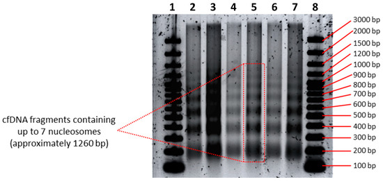 Cell-free DNA (cfDNA) separation and sizing by agarose gel electrophoresis. CfDNA was isolated from large volumes (~30 mL) of human bone osteosarcoma (143B) cell culture supernatant and loaded onto an agarose gel, revealing a clear laddering pattern showing seven distinct cfDNA populations up to seven nucleosomes in length. Wells 1 and 8 contain the GeneRuler 100 bp Plus DNA ladder. Wells 2, 4 and 6 were loaded with 60, 42 and 48 ng cfDNA, respectively (all containing 3 µL cfDNA sample, 2 µL loading dye and 3 µL H2O). Wells 3, 5 and 7 were loaded with larger volumes of the same cfDNA samples, amounting to 100, 70 and 80 ng cfDNA, respectively (all containing 5 µL cfDNA sample, 2 µL loading dye and 1 µL H2O). Electrophoresis parameters: pooled cfDNA samples concentrated with 30 KDa Amicon Ultra Centrifugal Filter Units were loaded onto a 10 cm-long TBE agarose gel (1.5%; 4 mm) and run with buffer TBE buffer (1X) for 90 min at 100 V. Before imaging, gels were stained with SYBR Gold Nucleic Acid Gel Stain for 40 min by gentle agitation.