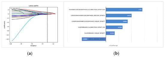 Radiomics signature feature selection and analysis. (a) The selection of the tuning parameter in the LASSO model via 10-fold cross-validation based on minimum criteria. (b) The radiomics signature contribution bar graph, showing the six ultimately retained radiomics features selected by LASSO and mRMR along with their contributions. The y-axis shows the 6 retained radiomics features, and the x-axis shows the corresponding LASSO regression coefficients.