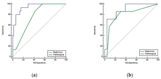 Radiomics and pathological model in the training and test groups. (a) The AUC of the radiomics signature model and pathological model in the training group was 0.946 and 0.761, respectively. (b) The AUC of the radiomics signature model and pathological model in the test group was 0.888 and 0.798, respectively.