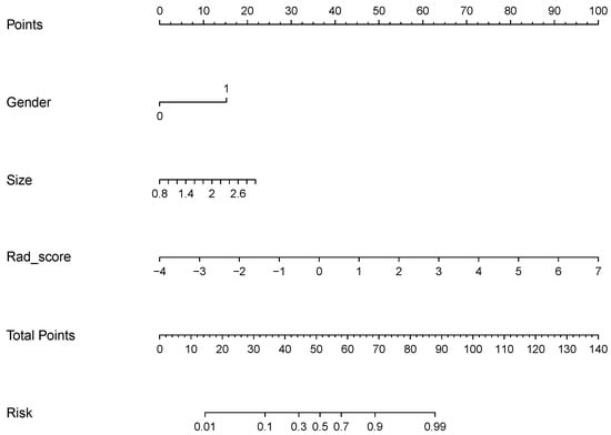 Nomogram for prognosis prediction. The nomogram was developed by integrating the rad-score with sex and tumor size. The probability of rad-score, sex and tumor size can be converted into the points according to the scale at the top of the nomogram by drawing a line straight upward to the “Points” axis. By summing the points for all predictors and locating the final sum on the “Total points” scale, we can predict the probability of recurrence or metastasis on the “Risk” scale.