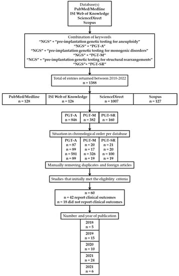 Therefore, the present manuscript aims to highlight the reproductive outcomes of all studies conducted in the last five years (2018–2022) when combining PGT-NGS in circumstances when equal to or more than 100 patients/couples were enrolled.