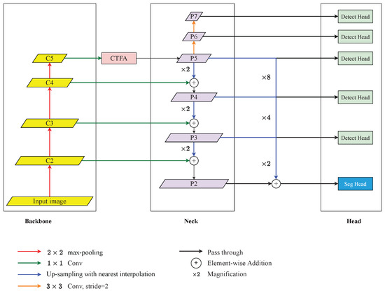 Considering that the features of an object might be separated into the feature pyramid, and a large magnification may cause some problems, this paper only fused together (Equation (7)). Explicitly, would be enlarged to the same resolution with and then summarized together. Afterwards, the fused feature maps would feed into the segmentation head which includes a series of convolution and up-sampling to generate the segmentation mask (Equation (8)).