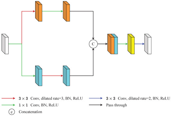Specifically, GA generated long-range relationships through two branches. The upper branch captured long-range context information by a dilated convolution whose kernel size was and the dilation rate was 3, and smooths the features by a point-wise convolution (Equation (1)). The lower branch grabbed local context information by a point-wise convolution and expands the influence of the features by a dilated convolution whose kernel size was and the dilation rate was 3 (Equation (1)). These two feature maps concatenated to form the feature maps . Then, passed through a point-wise convolution and a dilated convolution whose kernel size was and the dilation rate was 2 to produce the final output of GA, (Equation (2)). The point-wise convolution here was used to decrease the channel numbers and the dilated convolution was used to expand the influence of features again.