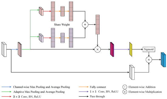 Specifically, SA can be separated into four steps. First, the input feature map was fed into two channel-wise poolings and generated two feature maps and , respectively. Afterwards, was concatenated with to generate as the Equation (3). By preserving more pooled channels, SA kept more of the channel information of the feature maps. Second, passed into adaptive max pooling and adaptive average pooling simultaneously to create and , respectively. Then, and would pass through one shared-weight convolution layer and two shared-weight fully connected layers to generate and as the Equation (4). By retaining a higher resolution, SA saved more spatial information than the traditional pooling method. Third, SA directly fused and with a element-wise summation. Thereafter, the mixed feature was element-wise multiplied with followed by a point-wise convolution layer as Equation (5). This step integrated channel attention weight into the spatial attention process and reduced the channel of the merged features with a point-wise convolution layer. Finally, the spatial attention feature, , passed through softmax to grab the spatial attention weight. Then, the output of SA, , was generated from the element-wise multiplication with and the spatial attention weight as the Equation (6).