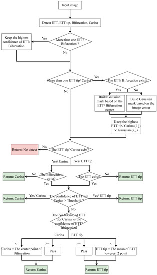 The process of the post-process algorithm is shown in Figure 5. In general, the algorithm has three steps. First, it found the highest confidence bounding box (bbox) of the ETT/tracheal bifurcation. Second, it applied a Gaussian mask based on the center of the ETT/tracheal bifurcation bbox or the center of the image to determine the best ETT tip/Carina. Finally, if the confidence of the best ETT tip/Carina was less than a threshold, then the best ETT tip/Carina would be generated after comparing with the confidence of the ETT/tracheal bifurcation bbox.