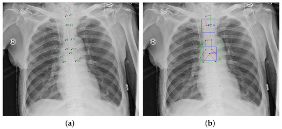 This paper was approved by the institutional review board (IRB) of the National Cheng Kung University (NCKU) Hospital (IRB number: A-ER-108-305). The chest radiograph dataset provided by NCKU Hospital includes 1,870 portable chest radiographs of intubated ICU patients in DICOM format and the ground truth (GT) annotations were labeled by two board-certified intensivists. The GT ETT was labelled by four points (), and the GT tracheal bifurcation was labelled by nine points (), as shown in Figure 6a. The purpose of this paper was to detect the malposition by locating the ETT tip and the Carina. Therefore, this paper adopted two boxes with a size of to label the feature point of the ETT tip which was the middle point of and , and the feature point of the Carina which was (the feature point of ETT tip and Carina are at the center of the boxes). Furthermore, the 13 points were corrected to be sequential for generating the GT mask. In summarize, the GT became Figure 6b. In Figure 6b, the green nodes denote the original points labeled by the intensivists, the blue nodes denote the ETT tip and Carina, the green boxes denote the GT bboxes of ETT and tracheal bifurcation, the blue boxes denote the GT bboxes of ETT tip and Carina, and the red polygons denote the GT mask of ETT and tracheal bifurcation. Finally, this paper used extra 150 chest radiographs to validate the proposed approach.