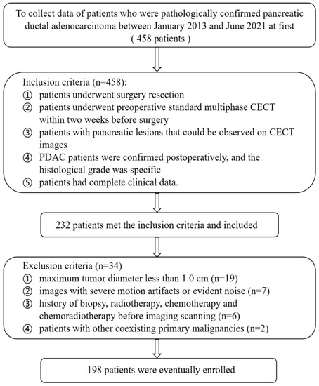 This research was authorized by the local ethics organization of the first affiliated hospital of Chongqing medical university (No: 2022-63), and informed consent was needless due to the retrospective nature. A total of 198 patients with primary PDAC receiving radical resection from January 2013 to June 2021 were enrolled as the internal training group. The external validation group from the third affiliated hospital of Chongqing medical university was consecutively collected from January 2022 to June 2022. The same inclusion standard between two centers was as follows: (1) patients underwent preoperative standard multiphasic CECT within two weeks before surgery; (2) pancreatic lesions should be observed visually through medical images; (3) PDAC patients were confirmed postoperatively, and the histological grade was specific; (4) patients had intact clinical data. The exclusion criteria were as follows: (1) tumor diameter is less than 10 mm; (2) serious motion artifacts or distinct noise existed; (3) treatment history of biopsy, radiotherapy, chemotherapy and chemoradiotherapy before imaging scanning; (4) other coexisting primary malignancies existed. The screened flowchart in internal center is described in Figure 1.