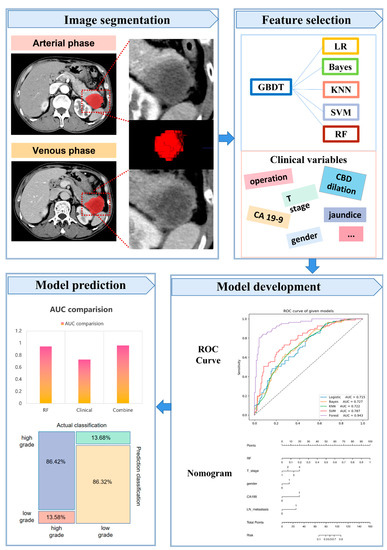 Histological grade is considered as a significant independent factor in PDAC, and low-grade PDAC is associated with longer postoperative survival [6,7], while high-grade PDAC is inclined to predict shorter survival and higher mortality [8]. Furthermore, high-grade PDAC do not have an obviously improved prognosis after radical surgery, and these patients could be influenced by postoperative complications such as pancreatitis and pancreatic fistula, and have to endure an awful quality of living [9,10]. Previous studies have reported [11,12,13], combining serum tumor biomarkers and invasive CT manifestation, high-grade PDAC is prone to receive chemotherapy, radiotherapy and palliative therapy, and low-grade PDAC without invasive signs was suggested to undergo operation as early as possible. Currently, the histological grade of PDAC is merely evaluated by postoperative specimen which is highly invasive and may delay the choice of available therapeutic protocol [14,15]. Moreover, the sample obtained by puncture biopsy is not accurate because it couldn’t represent the whole tumor due to heterogeneity in time and space. Thus, one precise and preoperative diagnosis tool is necessary for realizing precision medicine.