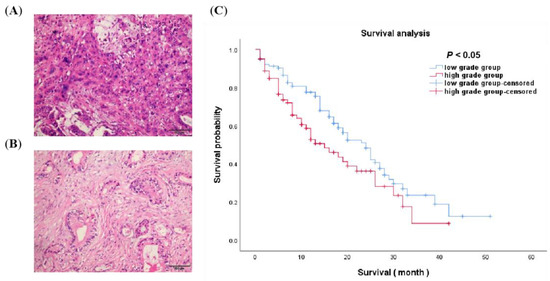 A comparison between patients within the low-grade and the high-grade group. (A) High-grade group pathological expression (×20). (B) Low-grade group pathological expression (×20). (C) The Kaplan–Meier curves of the two groups were significantly different (p < 0.05). Patients in the low-grade group had significantly longer survival than those in the high-grade group by log-rank test.