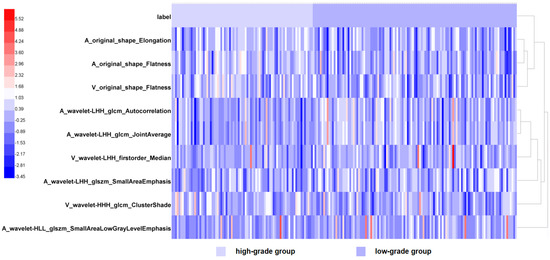 Heatmap of nine radiomics features including. The heatmap is grouped according to the low-grade group and the high-grade group. Each row corresponds to one radiomics feature, and each column corresponds to one patient. The rightmost lines represent hierarchical clustering of radiomics features, shown as a dendrogram.