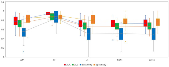 Comparison of five radiomics models based on ten times tenfold cross-validation in internal training group. Box-and-whisker plots of the differences in SVM, RF, LR, KNN and Bayes model among AUC, ACC, Sensitivity and Specificity. RF achieved the best performance in every statistical indicators than other models. The box indicates the 25- and 75- quartile; the horizontal line indicates the median and the cross indicates the mean. Whiskers show the 5- and 95- percentiles; outliers are indicated by circles.
