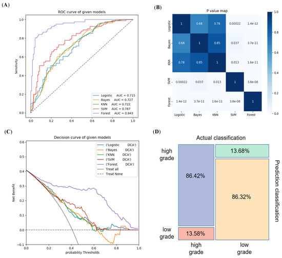 The performance evaluation of the five radiomics models in internal training group. (A) The RF model had the maximum AUC, followed by SVM, Bayes, KNN and LR. (B) DeLong test showed the AUC of RF model was significantly different than that of other models, followed by SVM model. (C) The decision curves show that the RF model had greatest net benefit with a threshold probability > 0.06. (D) Mosaic map showed the RF model achieved 86.42% and 86.32% predictive accuracy in the high-grade and the low-grade group, respectively.
