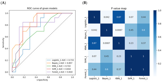 The performance evaluation of the five radiomics models in the external validation group. (A)The Bayes model had the maxium AUC, followed by RF model and SVM model. (B) Delong test showed there were no significant difference between RF, SVM and Bayes with AUCs each other.