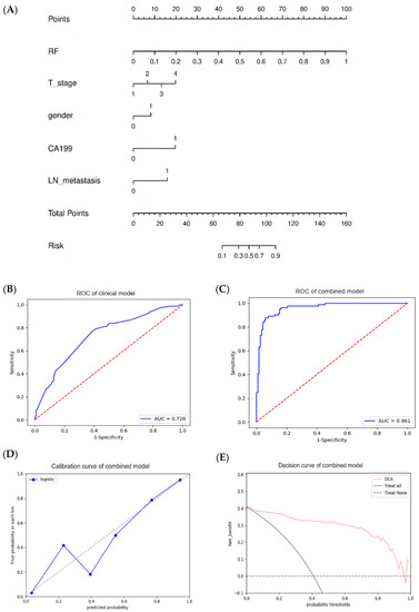 Construction of clinical and combined model in the internal training group. (A) A nomogram was visualized by integrating the best radiomics model-RF and screened clinical features including T stage, gender, CA199, lymph node metastasis. The clinical model (B) and combined model (C) achieved the modest and the best diagnostic performance, respectively. (D) The calibration curve of the nomogram presented a good consistency between predicted and observed histological grade. (E) The decision curve of the nomogram provided the best diagnostic efficacy over and above the “treat all” or “treat none” scheme.