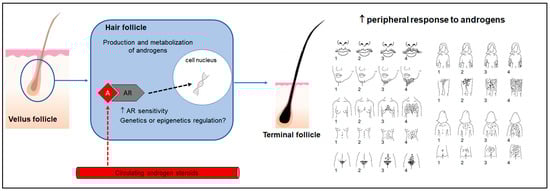 The importance of androgens for hair growth in humans was first established by Hamilton and colleagues in the 1950s [15], with observations that castration before puberty prevented the development of beard and axillary hair, whereas castration after puberty led to the atrophy of beard and axillary hair. In addition, patients with androgen insensitivity do not have pubic or axillary hair. Since then, androgens have been shown to increase hair follicle size in different body regions, hair diameter, and the proportion of time hair remains in the anagen stage [16]. The conversion of vellus to terminal hairs is mainly stimulated by androgens, through the prolongation of the anagen stage. Successive hair cycles and longer anagen duration promote an increase in follicle size. These larger follicles produce longer, thicker hair in androgen-dependent body areas. For this reason, androgen excess-related conditions, such as PCOS, are often associated with hirsutism [11,17].