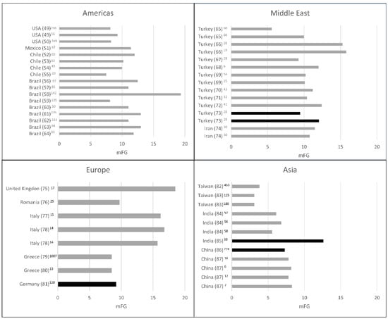 Although a universal mFG score cutoff would be useful for comparisons, ethnic variations, as well as skin type and other factors, should be considered when evaluating hirsutism in distinct populations [44]. Importantly, the data reported by Ferriman and Gallwey were derived from women attending a northern London general medical outpatient clinic, a selected homogeneous population. Besides that, other factors, such as obesity and insulin resistance, are known to play a role in the phenotypic expression of PCOS, and its predisposition also varies in different ethnic backgrounds [45]. Indeed, the international evidence-based guideline for the assessment and management of PCOS, published in 2018, proposes to consider ethnic origin when evaluating mFG scores in different populations [1]. The Endocrine Society also suggests different cutoffs for the mFG score depending on ethnicity, as follows: United States and United Kingdom black or white women, ≥8; Mediterranean, Hispanic, and Middle Eastern women, ≥9 to ≥10; South American women, ≥6; and Asian women, a range of ≥2 for Han Chinese women to ≥7 for Southern Chinese women [46]. Subsequently, data from a systematic review comparing hirsutism in women with PCOS from populations of different ethnicities showed that, compared with white women, East Asian women were less hirsute, whereas Hispanic women, South Asian women and Middle Eastern women were more hirsute [47]. In another systematic review and meta-regression analysis, FG scores were presented according to their distribution in different countries [48]. However, few data are available on hirsutism in women with PCOS from Latin America. In this respect, Figure 2 shows a comprehensive distribution of mFG scores based on studies from different countries [49,50,51,52,53,54,55,56,57,58,59,60,61,62,63,64,65,66,67,68,69,70,71,72,73,74,75,76,77,78,79,80,81,82,83,84,85,86,87], which include available data from the database of a systematic review on Latin American women with PCOS that we have recently published [88]. Importantly, most studies come from referral populations, which may have influenced the difference in FG scoring between regions, according to ethnicities.