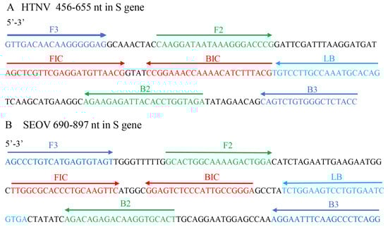 The LAMP primers and probes for HTNV and SEOV were designed through Primer Explorer V5 software (http://primerexplorer.jp/lampv5e/index.html, accessed on 10 June 2021) after multiple alignment using MEGA7 software. Primers were synthesized by Sangon Biotech (Shanghai, China). Each set of primers contained two external primers (F3 and B3), two internal primers (FIP and BIP), and loop primers (LB) (Table S1). LB was synthesized as the HFman probe labeled with FAM/Cy5 fluorophore and a BHQ1/BHQ2 quencher group at 3′- and 5′-end of HTNV and SEOV, respectively (Table 1).