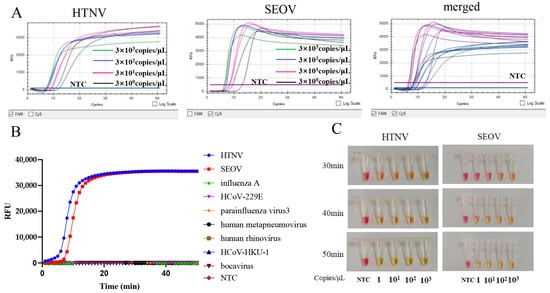 A ten-fold serial diluted HTNV and SEOV RNA standards from 103 to 1 copies/μL were used to determine the sensitivity of the multiplex RT-LAMP assay. The results show that the multiplex RT-LAMP can detect as few as 3 copies of HTNV and SEOV RNA per reaction within 15 min (Figure 3A).