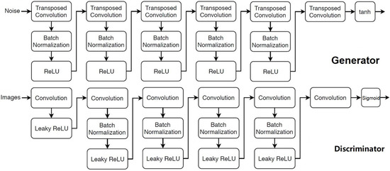 except in the first convolutional layer where no batch normalization was used, and in the last convolutional layer which is only followed by a sigmoid function. The stride in the convolution layer (discriminative network) and the transposed convolution layer (generative network) is 2. The network structure of the generator and discriminator is presented in Figure 3.