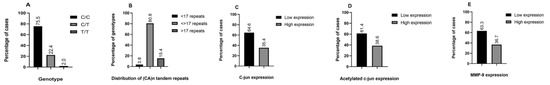 Distribution of -1562 C/T (A) and -131(CA)n (B) MMP-9 polymorphisms and c-Jun (C), acetylated c-Jun (D), and MMP-9 € expression patterns in PTC samples (E).