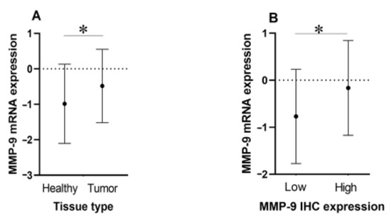 Comparison of relative MMP-9 mRNA levels between PTC and adjacent conditionally healthy tissue (A) and low and high MMP-9 protein expression groups in PTC (B). * p < 0.05.