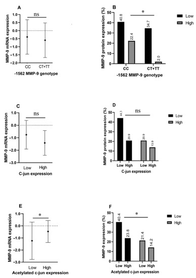 MMP-9 mRNA levels are not differentially expressed between CC genotype and T allele carriers (A), nor between c-Jun high and low expression groups (C); however, the acetylated c-Jun high expression group displayed significantly increased MMP-9 mRNA levels compared with the low expression group (E). MMP-9 protein expression levels differ between different genotypes at the -1562 position (B) and acetylated c-Jun expression groups (F), but not c-Jun expression levels (D). * p < 0.05.