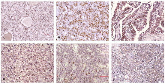 Micrograph illustrating the expression of c-Jun, acetylated c-Jun, and MMP-9 in representative PTC samples. The upper row of the micrograph represents cases with extra-thyroid invasion, showing: (A) weak widespread staining of c-Jun (low expression group), (B) strong diffuse staining of acetylated c-Jun in most tumor cells (high expression group), and (C) strong diffuse staining of MMP-9 in most tumor cells (high expression group). The lower row presents indolent cases of PTC, showing: (D) moderate staining of c-Jun in more than 40% of tumor cells (high expression group), (E) focal (up to 40% of tumor cells) staining of acetylated c-Jun (low expression group), and (F) weak widespread staining of MMP-9 (low expression group). Scale bars represent 50 µm.