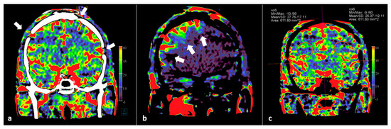 - Kitajima, M.; Hirai, T.; Shigematsu, Y.; Fukuoka, H.; Sasao, A.; Okuda, T.; Morioka, M.; Kai, Y.; Yamashita, Y. Assessment of cerebral perfusion from bypass arteries using magnetic resonance regional perfusion imaging in patients with moyamoya disease. Jpn. J. Radiol. 2010, 28, 746–753. [Google Scholar] [CrossRef]