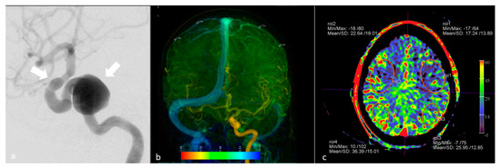 In selected cases, parent vessel occlusion (PVO) can be applied as a safe and effective treatment option in complex, large artery aneurysms, post-traumatic arterial lesions or skull base tumors [63,64,65]. In such patients, especially in case of intended carotid artery occlusion, temporary balloon test occlusion (BTO) is used to evaluate the capability of a patient to endure the vessel occlusion. During test occlusion repeated clinical tests are performed, searching for signs of insufficient collateral blood flow to the tested hemisphere. In addition to clinical testing, conventional DSA is used for assessment of synchronicity in cortical venous filling (<2 s delay in the tested hemisphere) [66]. Nevertheless, a substantial part of the patients will suffer from delayed ischemic complications, despite passing the BTO clinically and angiographically [67]. Additional FD CT PBV imaging during test occlusion can yield more information about the suitability of PVO by calculating regional PBV values in different topographical areas of the brain, and comparing them with those derived from the non-affected contralateral hemisphere, especially combined with parametric color coding or plotted 2D time-density curves of DSA images. In a well-tolerated test occlusion, the goal should be to find normal PBV values without asymmetry. In theory, in case of elevated CBV or PBV values in the affected cerebral hemisphere, the brain is already trying to maximize its blood supply through reactive vasodilatation. Although no clinical symptoms might be present, the patient is at risk for delayed ischemic complications after PVO. In case of lowered CBV or PBV, the patient will show clinical symptoms already during test occlusion.