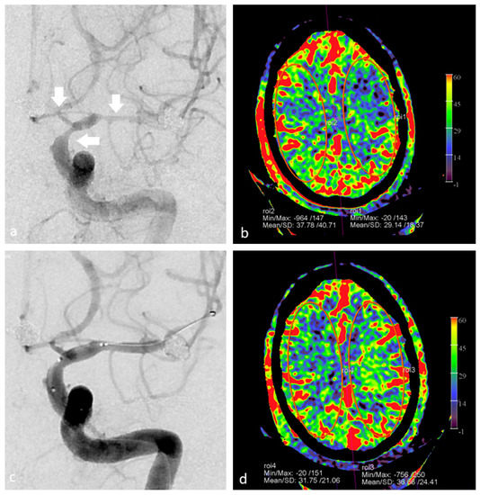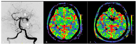 - Fujimoto, M.; Itokawa, H.; Moriya, M.; Okamoto, N.; Sasanuma, J. Evaluation of Cerebral Hyperperfusion After Carotid Artery Stenting Using C-Arm CT Measurements of Cerebral Blood Volume. Clin. Neuroradiol. 2018, 28, 253–260. [Google Scholar] [CrossRef]
