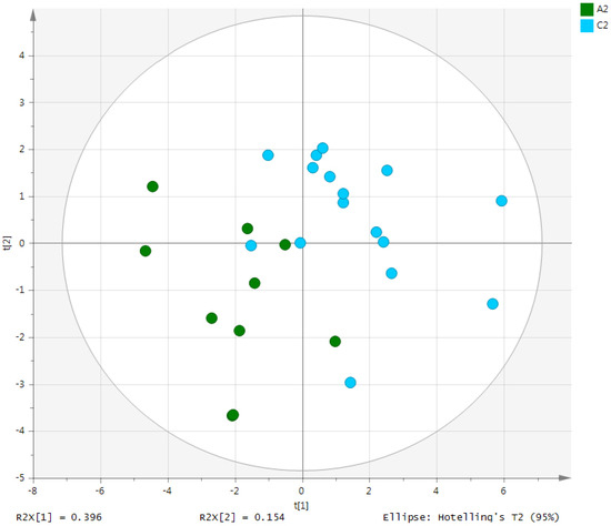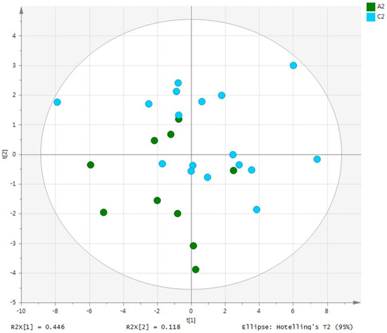 PCA score plot derived from the 1H-NMR spectra of serum from the ulcerative colitis (UC) patient group (n = 10) and healthy control (HC) group (n = 10). PCA, principal component analysis; NMR, nuclear magnetic resonance; A2, ulcerative colitis group; C2, healthy control group.