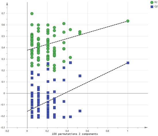 Validation of the OPLS model using the 100-permutation test.