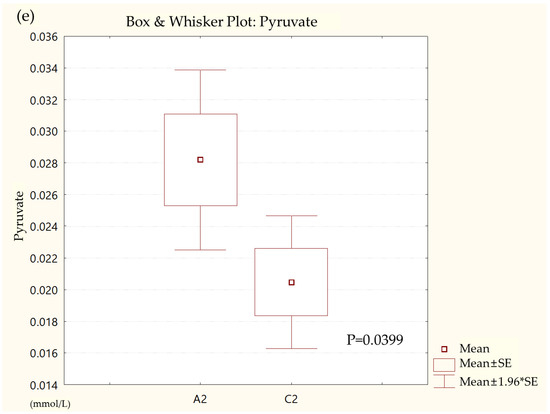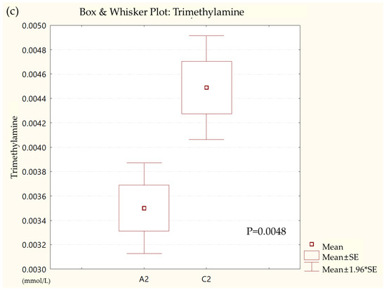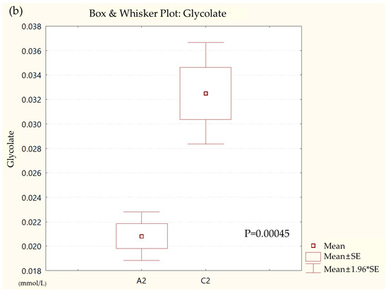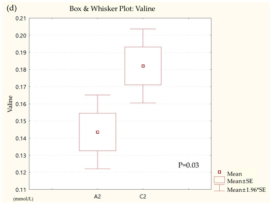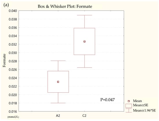 Box and whisker plot of (a) formate, (b) glycolate, (c) trimethylamine, (d) valine, and (e) pyruvate in ulcerative colitis (UC) patient group and healthy control (HC) group. A2, ulcerative colitis patient group; C2, healthy control group.