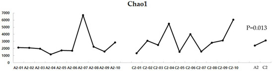 Alpha diversity of the UC and HC groups. UC, ulcerative colitis; HC, healthy control; A2, ulcerative colitis patient group; C2, healthy control group.