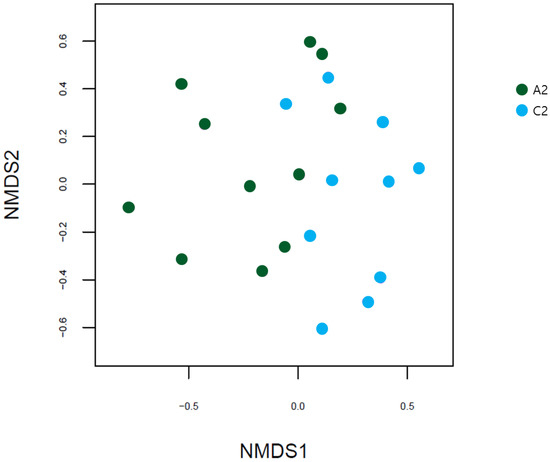 NMDS plots based on Bray-Curtis distances between the UC and HC groups. NMDS, non-metric multidimensional scaling; UC, ulcerative colitis; HC, healthy control; A2, ulcerative colitis patient group; C2, healthy control group.