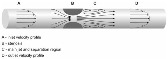 Arteriovenous fistula with a stenosis: hemodynamic implications.Legend: vascular segments are marked A–D. A = laminar flow; B = stenosis with flow acceleration; C = region of separation with reversed flow; D = area of flow reattachment. A significant stenosis causes blood pressure to drop, i.e., blood pressure in segment “A” is higher than in “B”. Flow acceleration depends on stenotic severity and on the geometry (asymmetric stenosis causes a higher pressure drop than symmetric stenosis). Flow separation that occurs just distal to the stenosis is responsible for the pressure drop but also narrows the flow jet even more significantly than the stenosis itself. Laminar flow is associated with physiological values of wall shear stress (WSS). WSS, however, increases inside the stenosis, where they can denudate endothelium and activate the von Willebrand factor. WSS has a changing vector in the segment “C”, which contributes to intimal hyperplasia development.