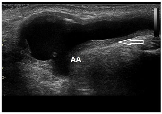 The feeding artery (including the subclavian artery) could be affected by atherosclerosis and/or medial calcinosis. Atherosclerosis is relatively rare in the upper extremity arteries but more frequent in the subclavian or innominate artery. The latter must be suspected when low Qa has no clear explanation (Figure 6). Severe subclavian artery stenosis or occlusion could also be visualized indirectly by the flow reversal in the ipsilateral vertebral artery. While atherosclerosis affects the intimal layer of the arterial wall, medial calcinosis affects the medial (muscle) layer and is typical, particularly for patients with advanced type 2 diabetes mellitus. Medial calcinosis can be specifically observed in the forearm (and hand) arteries and is characterized by a diffuse arterial narrowing and hyperechoic arterial wall. It could be responsible for slow AVF maturation, low Qa, and/or hand ischemia [17].